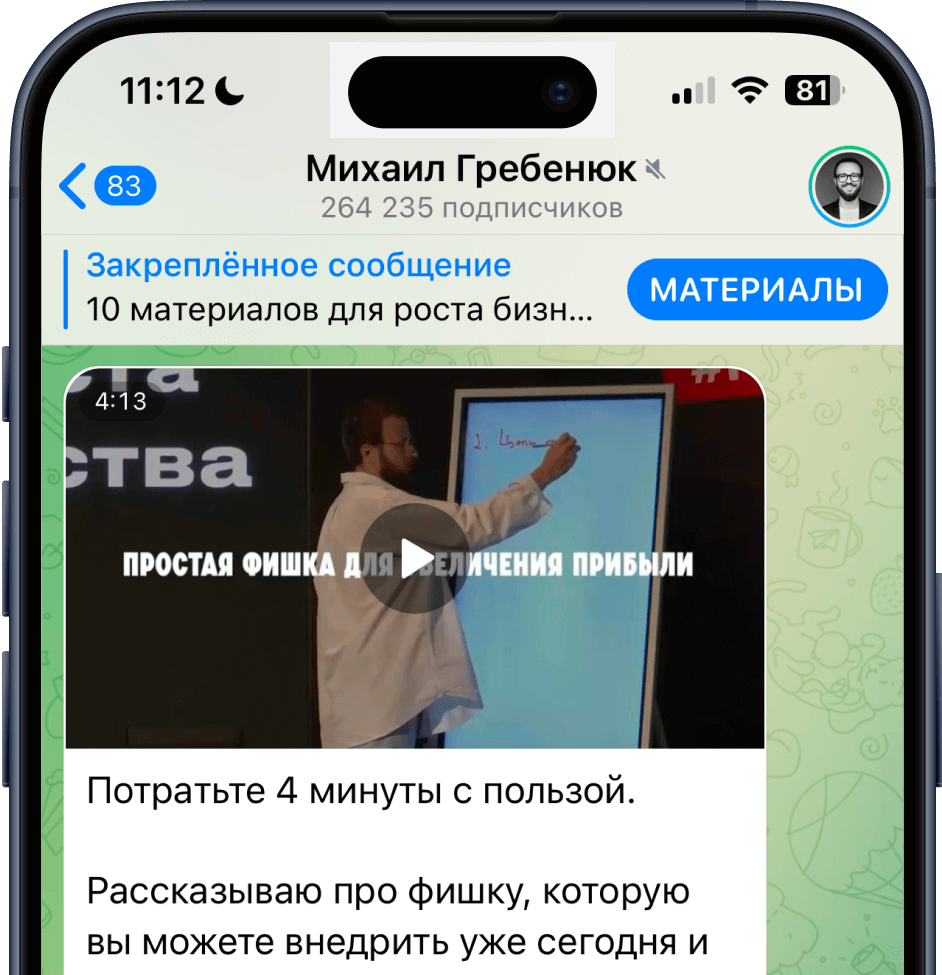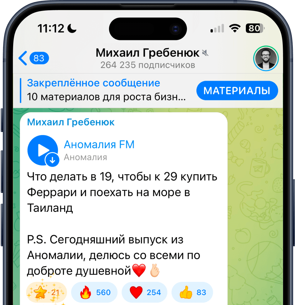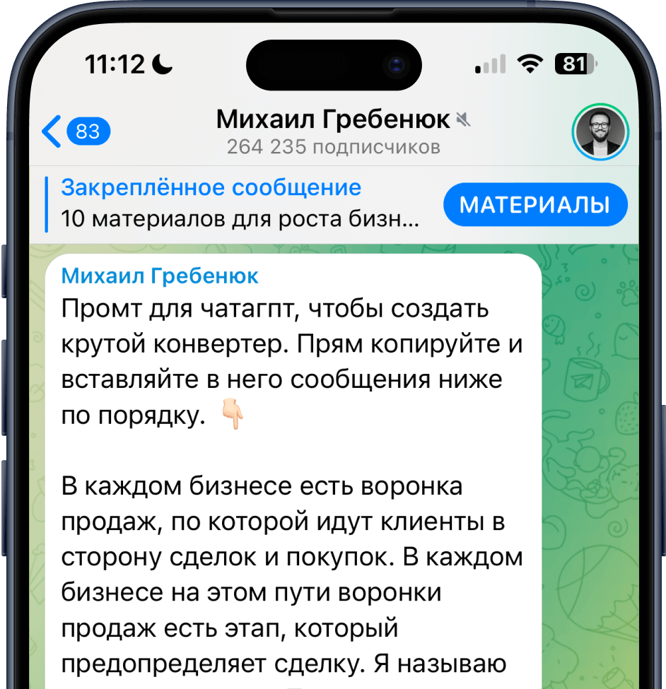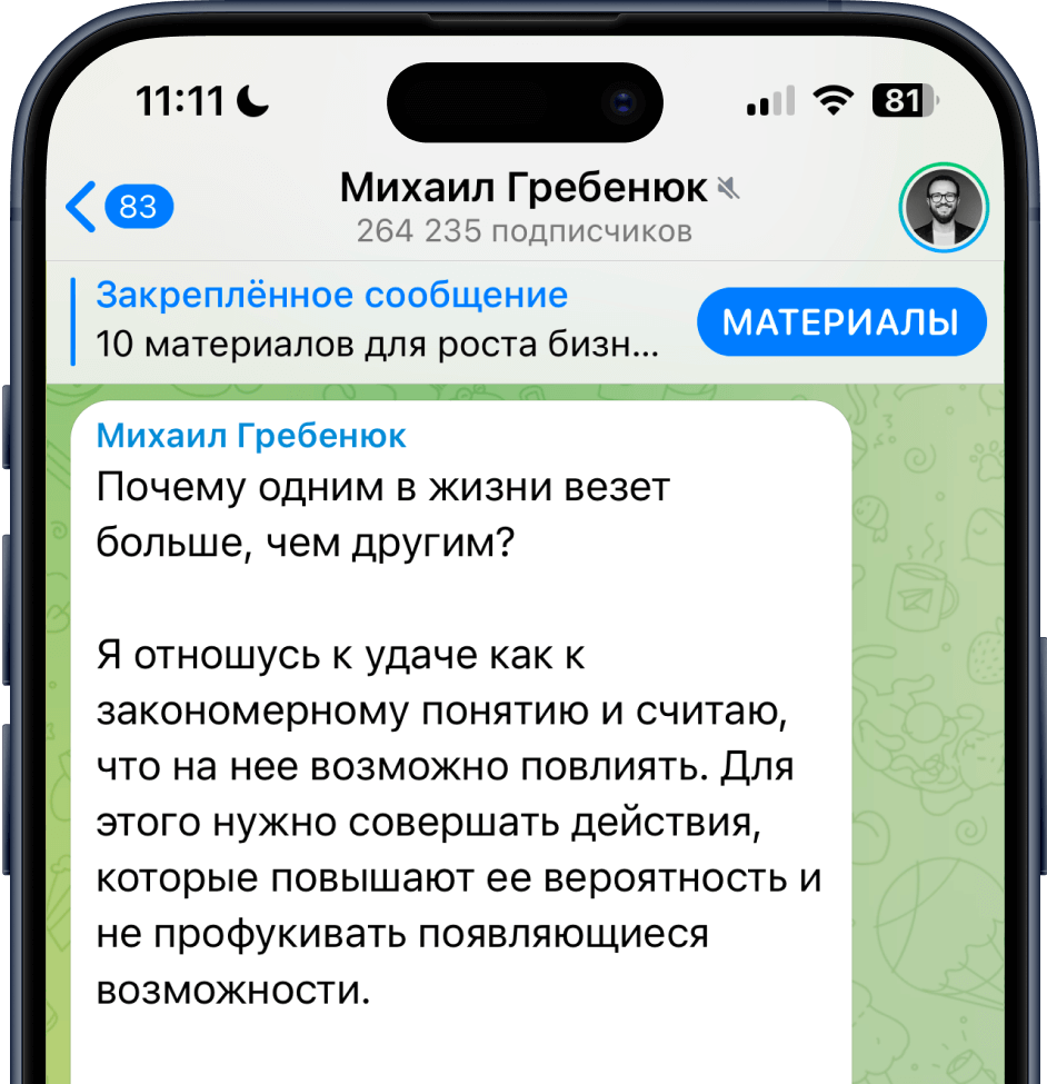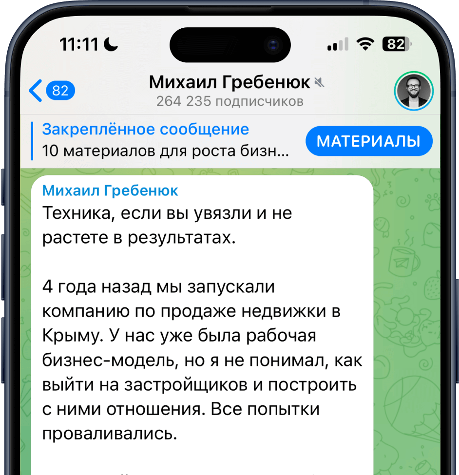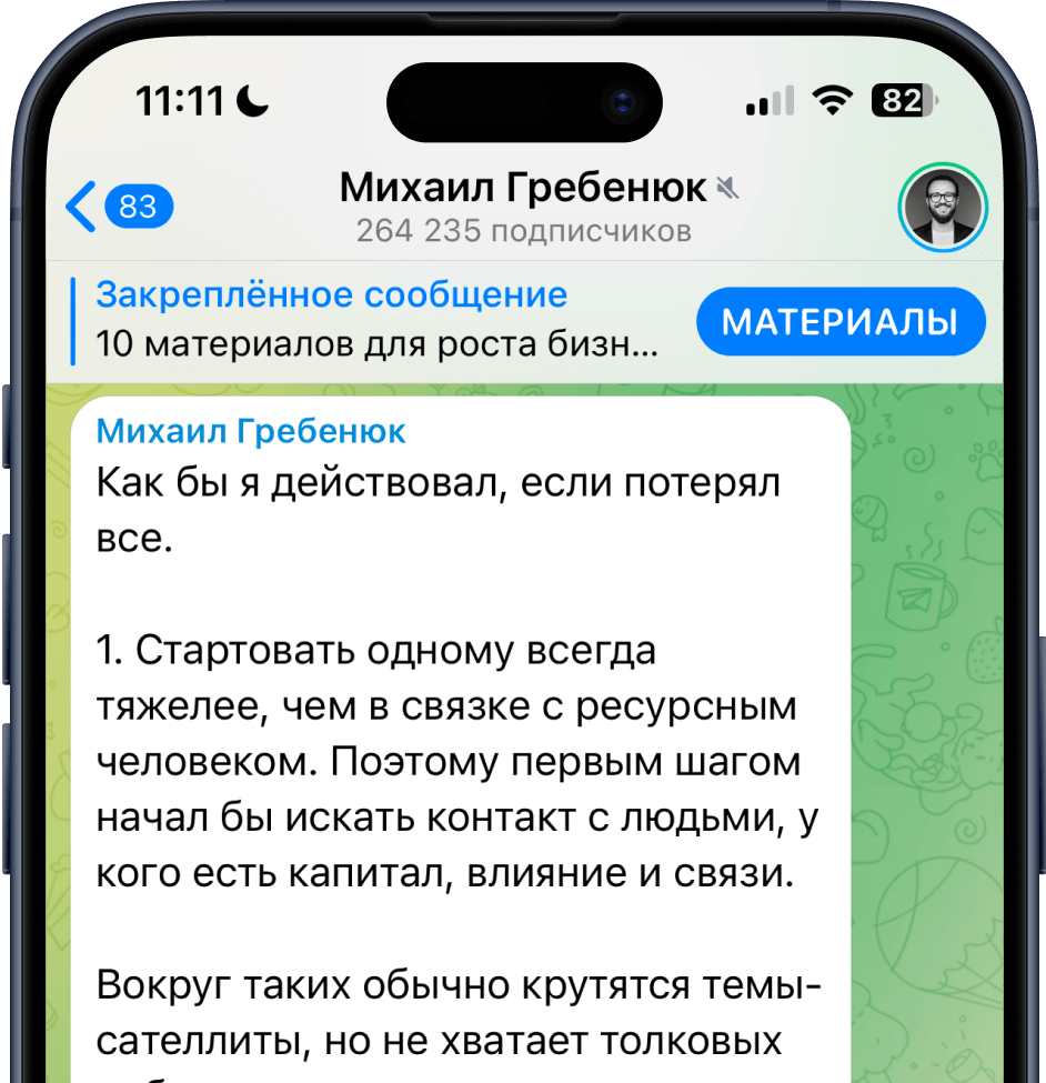 В телеграм канале я делюсь реальным опытом, который прошёл сам. Но в нем нет «душной пользы» и постоянной «экспертности». Я за трушность и показываю жизнь такой, какая она есть. Публикую не только все про бизнес, но и мемы, истории, эмоции.